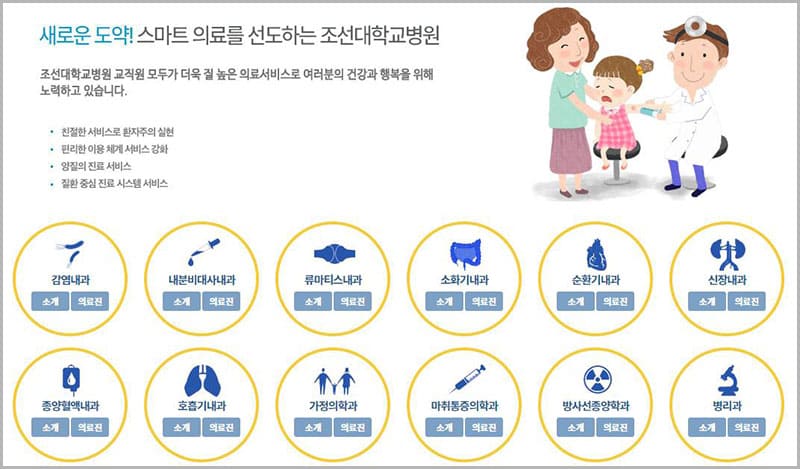조선대학교병원은 총 31개의 진료과를 운영하고 있으며, 관절센터, 뇌졸중센터, 당뇨병센터 등 다양한 전문진료센터도 함께 운영하고 있습니다. 지금부터 조선대학교병원 예약, 건강검진센터 예약 및 안내, 진료과 소개, 외래 진료 안내 등 홈페이지를 통해 자세한 정보를 살펴보겠습니다.