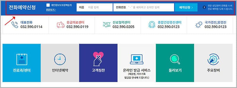 검단탑병원 진료 예약은 메인 페이지에서 바로 가능합니다. 우선 처음진료를 신청하시는 분은 “전화예약신청”에서 연락처를 남긴 후 “예약신청” 버튼을 눌러서 상담 신청을 해주시면 됩니다. 전문 상담원이 연락을 하여 진료에 필요한 부분을 도와줍니다.