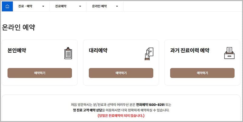 처음 진료를 보신 분은 다음 방문부터 온라인 진료 예약이 가능합니다. 온라인 예약을 위해서는 회원가입 및 로그인 또는 본인 인증 과정을 거쳐야 정상적인 이용이 가능합니다. 온라인 예약은 24시간 가능하며, 홈페이지를 통해 의료진과 진료일정을 직접 선택하여 예약 및 취소까지 할 수 있습니다.