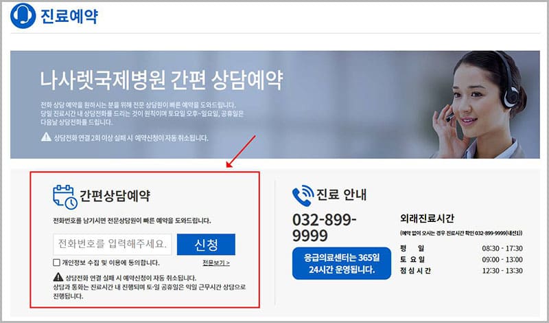 나사렛 병원 진료 예약은 간편 상담예약과 전화 예약으로 나누어집니다. 바쁘신 분들은 홈페이지에서 ‘간편상담예약’에 간단한 연락처를 남겨 주시면, 전문 상담원이 연락을 하여 예약에 필요한 부분을 도와줍니다. 그 밖에는 예약 대표 전화번호로 예약하시면 됩니다.
