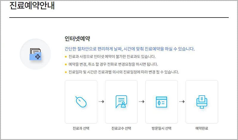 처음 진료를 보신 분은 다음 방문부터 온라인 진료 예약이 가능합니다. 온라인 예약을 위해서는 회원가입 및 로그인 또는 본인 인증 과정을 거쳐야 정상적인 이용이 가능합니다. 온라인 예약은 24시간 가능하며, 홈페이지를 통해 의료진과 진료일정을 직접 선택하여 예약 및 취소까지 할 수 있습니다.