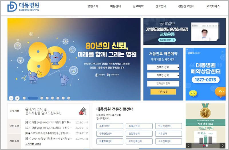 대동병원 진료 예약은 메인 페이지에서 바로 가능합니다. 우선 처음진료를 신청하시는 분은 “처음 진료 빠른 예약”에서 연락처를 남긴 후 “예약신청” 버튼을 눌러서 상담 신청을 해주시면 됩니다. 전문 상담원이 연락을 하여 진료에 필요한 부분을 도와줍니다.