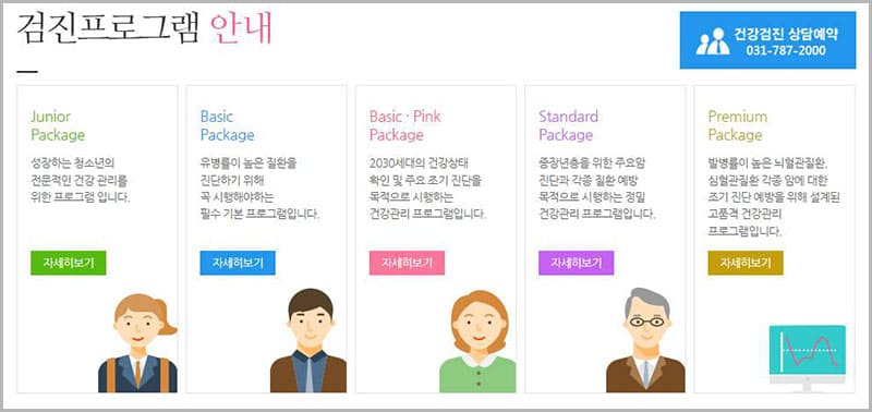 | Premium Package | 발병률이 높은 뇌혈관질환, 심혈관질환, 각종 암에 대한 조기 진단 및 예방을 위해 설계된 고품격 건강관리 프로그램 |