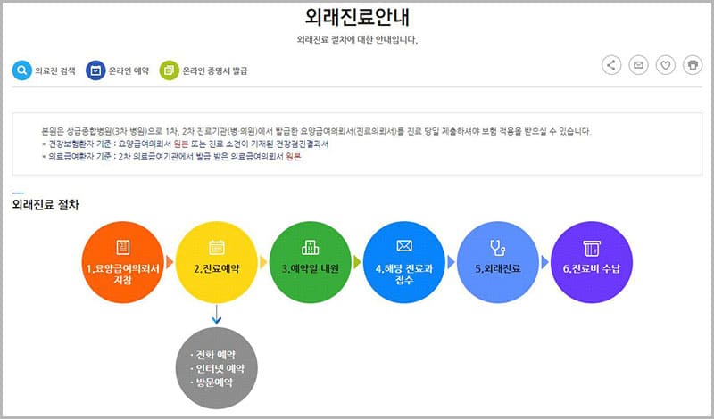 - 상급종합병원(3차)은 1차, 2차 진료기관(병·의원)에서 발급한 요양급여의뢰서(진료의뢰서)를 진료 당일 지참하여 방문하셔야 국민건강보험 적용을 받을 수 있습니다.