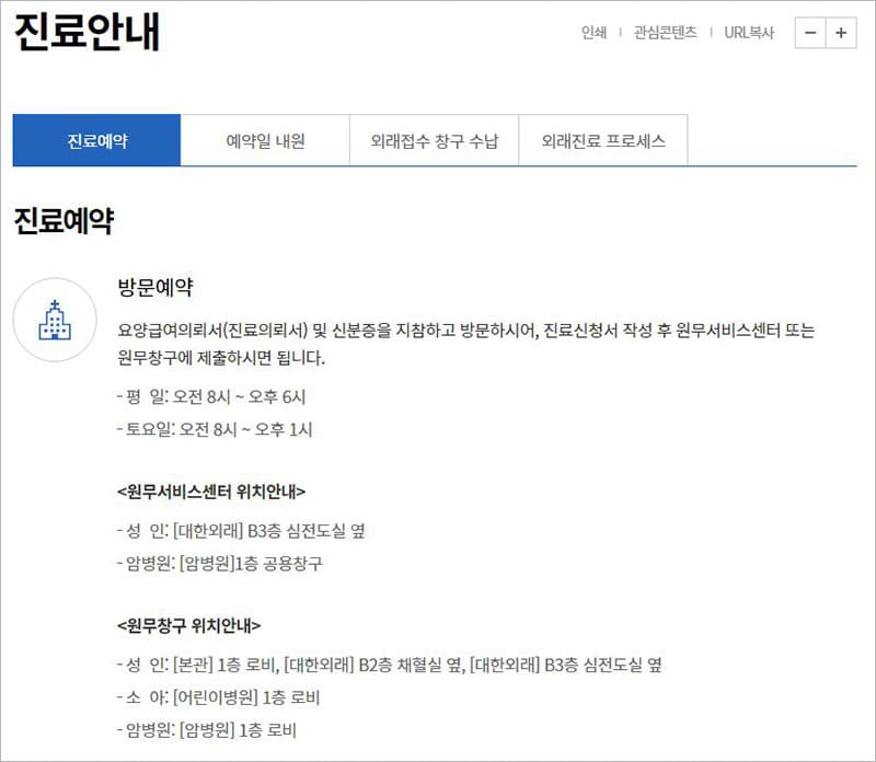 3) 방문예약 : 초진의 경우 반드시 요양급여의뢰서(진료의뢰서)와 신분증을 지참하신 후 방문하셔야 하며, 진료신청서 작성 후 원무과 또는 원무창구에 제출하시면 됩니다. 시간은 평일 오전 8시 ~ 오후 6시, 토요일 오전 8시 ~ 오후 1시까지입니다.