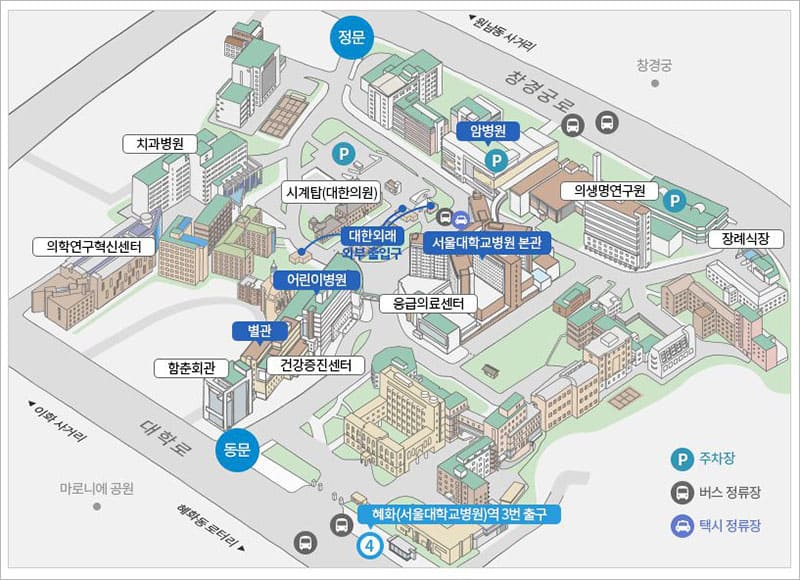 서울대학교병원을 방문하시기 전에 참고하셔야 할 것 중에 병원 부속 건물 위치, 주차 안내 등의 사항도 참고하시는 게 좋습니다. 병원 홈페이지에서는 병원 통합 안내도, 원내 위치도, 진료과 및 검사실 위치, 주차안내 등에 대해 자세하게 제공하고 있으며, 그 밖에 오시는 길, 원내 편의시설, 주변 편의시설 등에 대해 자세하게 안내하고 있습니다.
