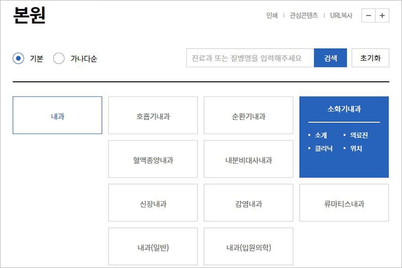 | 호흡기내과 | 순환기내과 | 소화기내과 | 혈액종양내과 | 내분비대사내과 | 알레르기내과 |