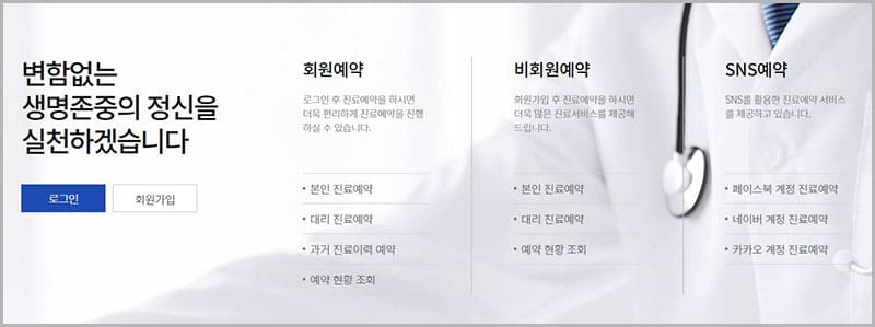병원 홈페이지에 회원가입 후 이용하실 수 있으며, 바쁘신 분은 ‘비회원예약’ 또는 ‘SNS예약’을 이용하여 빠른 예약을 하실 수 있습니다. 예약은 본인 및 대리 진료 예약이 가능하며, 언제든지 예약 현황을 조회하실 수 있습니다. 회원가입을 하시면 과거 진료이력 등을 지속적으로 관리하실 수 있으므로, 병원을 계속 이용하시려는 분은 회원가입 후 예약하시는 것을 추천합니다. 온라인 예약은 24시간 이용 가능합니다.
