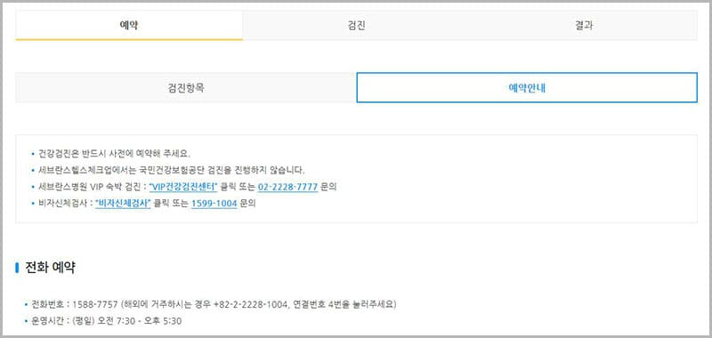 세브란스병원 건강증진센터에서는 개인 및 기업을 위한 건강검진 프로그램을 운영하고 있습니다. 전화 예약은 1588-7757 (해외 거주하는 경우 +82-2-2228-1004, 연결번호 4번)이며, 운영시간은 평일 오전 7:30 ~ 오후 5:30까지 가능합니다.