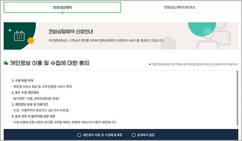 아인병원 진료 예약은 메인 페이지에서 바로 가능합니다. 우선 처음진료를 신청하시는 분은 “전화상담 예약”에서 연락처를 남긴 후 “예약신청” 버튼을 눌러서 상담 신청을 해주시면 됩니다. 전문 상담원이 연락을 하여 진료에 필요한 부분을 도와줍니다.