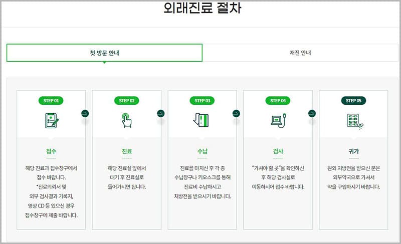 이 외에 다른 진료과는 요일별 진료 시간이 조금씩 다르므로, ‘진료시간 안내‘를 반드시 참고해 주시기 바랍니다. 진료절차는 간단하게 외래진료접수 ▶ 진료 ▶ 수납 ▶ 처방전 교부, 채혈, 주사, 각종검사, 촬영(예약) 등의 순서로 진행되며, 자세한 사항은 진료안내 페이지를 참고하시기 바랍니다.