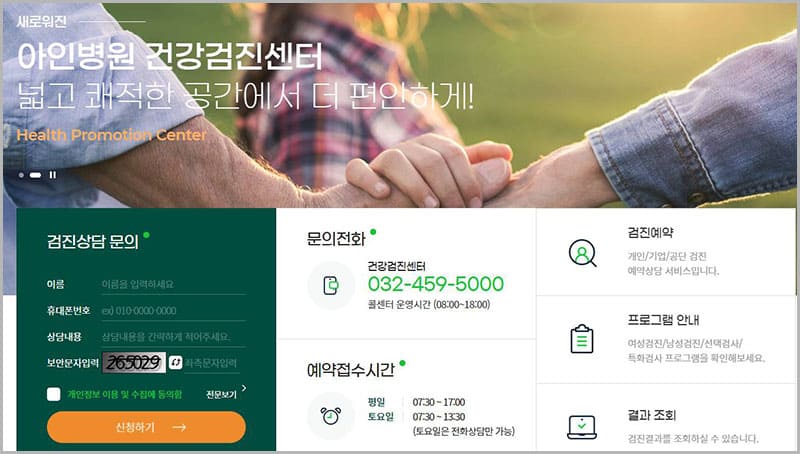 아인병원 건강검진센터에서는 쉽고 빠르게 건강검진 전화예약(032-459-5000)을 할 수 있으며, 종합검진예약 후에는 예약내역조회 및 검진결과를 온라인에서 모두 조회해 볼 수 있습니다. 전화예약 콜센터 운영시간은(08:00 ~ 18:00)까지이며, 방문예약은 아인병원 3층 건강검진센터(인천광역시 미추홀구 주안동 454-1)에서 하실 수 있습니다.