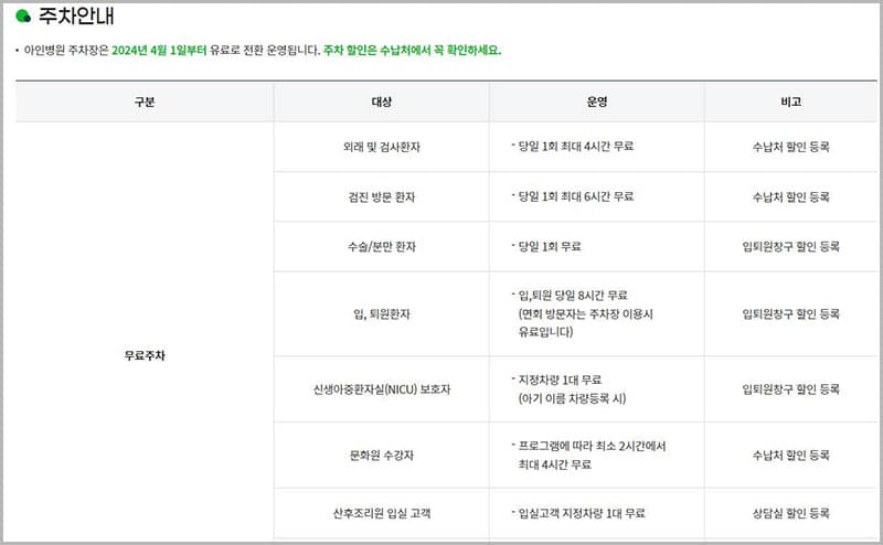 아인병원을 이용하실 때 참고하면 편리한 주차안내, 층별 안내도, 원내 편의시설, 오시는 길 등의 이용안내 페이지입니다. 특히, 주차요금 및 무료 주차 가능 여부를 확인하시려면 본 페이지를 참고하시기 바랍니다.