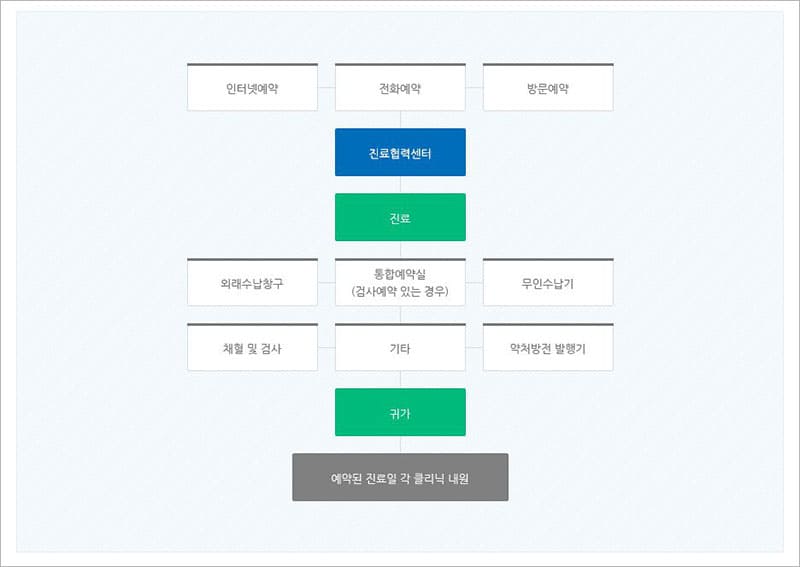 - 방문 예약 : 가장 일반적인 방법이며, 병원에 직접 방문하신 후 예약 및 진료를 보실 수 있습니다. 다만, 병원에서 대기해야 될 수도 있으므로 바쁘신 분들은 다른 방법을 이용하시는 게 좋습니다.