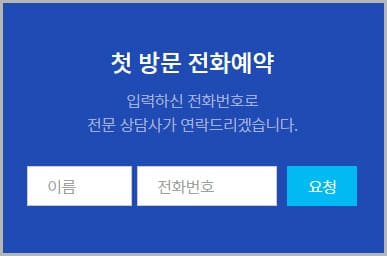 병원에 처음 방문하시는 분들의 진료 예약을 도와드리기 위한 서비스로, 홈페이지 내 ‘첫 첫 방문 전화 예약’ 서비스에서 성함, 연락처를 남기면 전문 상담사가 연락을 드려 쉽고 빠르게 예약을 할 수 있도록 도와 드립니다.