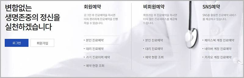 병원 홈페이지에 회원가입 후 이용하실 수 있으며, 비회원 예약이나 SNS예약도 가능합니다. 회원가입 후 예약을 하신 경우에는 예약 현황, 과거 진료이력을 관리하실 수 있으므로 회원가입 후 예약하시는 것을 추천드립니다. 인터넷 예약은 24시간 이용이 가능합니다.