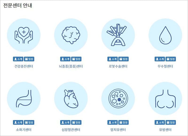 | 건강증진센터 | 뇌졸중(중풍)센터 | 로봇수술센터 | 무수혈센터 | 소화기센터 |