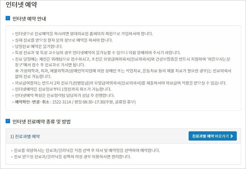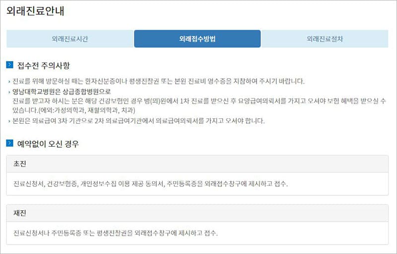 오늘은 영남대학교병원 예약 신청 방법, 건강검진 예약 방법, 진료과 및 의료진 안내, 외래 진료 안내, 병원 시설 안내 등에 대해서 알아봤습니다.