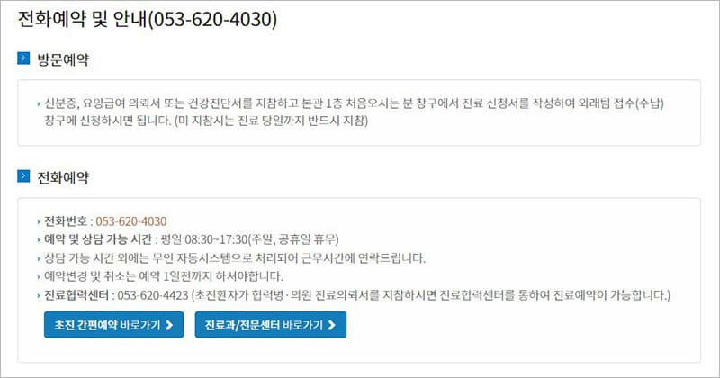 3) 전화예약 : 가장 간편한 방법으로 영남대학교병원 대표 전화번호 053-620-4030로 연락하시면 됩니다. 평일 08:30 ~ 17:30분까지 예약 및 상담이 가능하며, 주말과 공휴일은 휴무입니다.