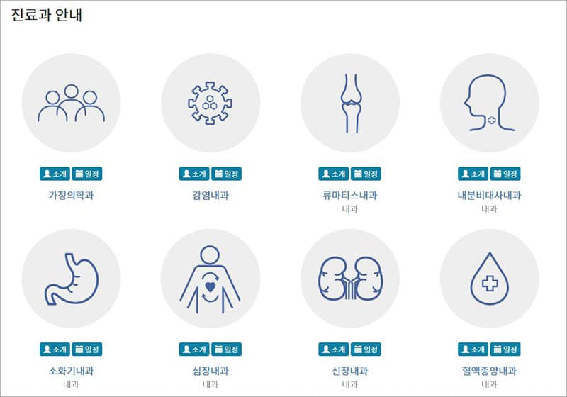 | 가정의학과 | 감염내과 | 류마티스내과 | 내분비대사내과 | 소화기내과 |