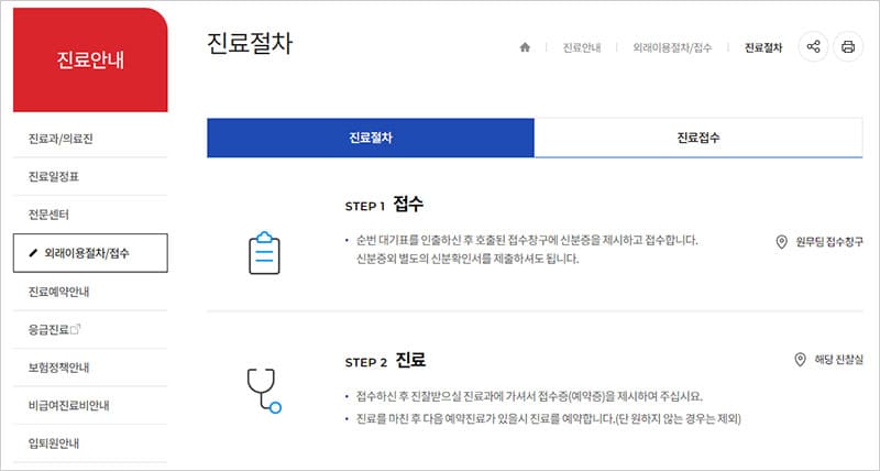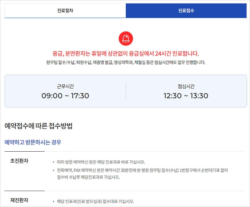 온라인 및 전화 예약 후에 방문하시는 분들은 바로 진료과에 가셔서 대기하셔야 합니다. 초진환자의 경우 예약시간 30분 전에 병원 원무팀 접수 1번 창구에서 순번대기표 없이 접수비를 먼저 수납하신 후 예약하신 진료과에 가셔서 대기하시면 됩니다.