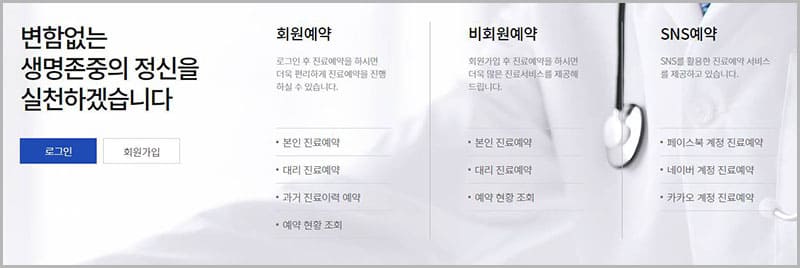 병원 홈페이지에 회원가입 후 이용하실 수 있으며, 간단한 인증절차를 거친 후 비회원 예약 또는 SNS 예약도 가능합니다. 회원가입 후 이용하시면 예약 현황, 과거 진료이력 등 전반적인 관리를 할 수 있어 무척 편리합니다. 인터넷 예약은 24시간 이용 가능합니다.
