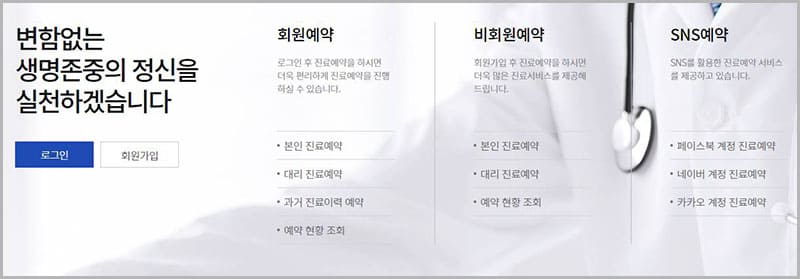 병원 홈페이지에 회원가입 후 이용하실 수 있으며, 가입이 어렵거나 바쁘신 분은 간단한 인증절차를 거친 후 비회원 예약 또는 SNS 예약을 하실 수 있습니다. 회원가입 후 예약을 하시면 본인의 예약 현황, 과거 진료이력 등 회원 전용 서비스를 이용할 수 있어 편리합니다. 인터넷 예약은 24시간 이용 가능합니다.