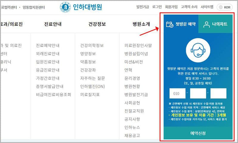 인하대병원 진료 예약은 메인 페이지에서 바로 가능합니다. 우선 처음진료를 신청하시는 분은 “첫 진료예약 상담”에서 연락처를 남긴 후 “예약신청” 버튼을 눌러서 상담 신청을 해주시면 됩니다. 전문 상담원이 연락을 하여 진료에 필요한 부분을 도와줍니다.