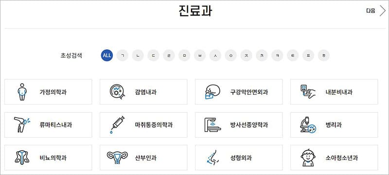| 외과 | 응급의학과 | 이비인후과 | 재활의학과 |