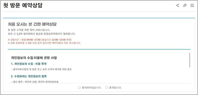 충북대학교병원 진료 예약은 메인 페이지에서 바로 가능합니다. 우선 처음진료를 신청하시는 분은 “첫 진료예약 상담”에서 연락처를 남긴 후 “예약신청” 버튼을 눌러서 상담 신청을 해주시면 됩니다. 전문 상담원이 연락을 하여 진료에 필요한 부분을 도와줍니다.