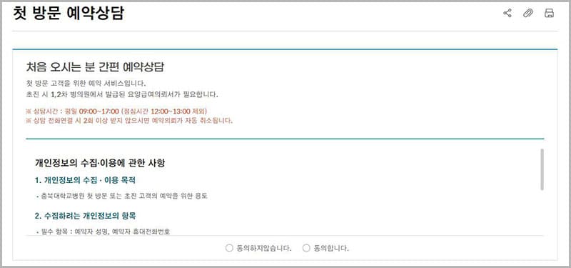 3) 인터넷 진료예약 : 충북대병원 홈페이지 예약 메뉴에서 인터넷 진료 예약을 하실 수 있으며, 쉽고 편리하게 24시간 예약이 가능합니다. 인터넷 예약은 진료과 및 의료진 정보를 미리 검색해 볼 수 있어 무척 편리합니다.
