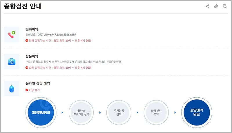 3) 검진 예약은 상담 전화 043-269-6747, 6566, 8566, 6887를 통해 예약을 하실 수 있습니다. 상담시간은 오전 10시 ~ 오후 4시 30분(점심 오전 12시 ~ 오후 1시)까지 가능합니다.