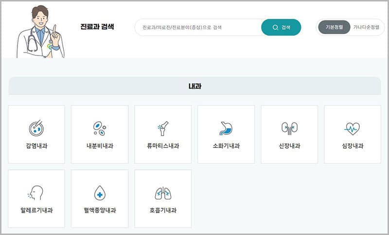 | 감염내과 | 내분비내과 | 류마티스내과 | 소화기내과 | 신장내과 |