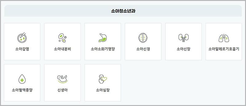 | 소아청소년과(소아내분비) | 소아청소년과(소아소화기영양) | 소아청소년과(소아신경) | 소아청소년과(소아신장) | 소아청소년과(소아알레르기호흡기) |