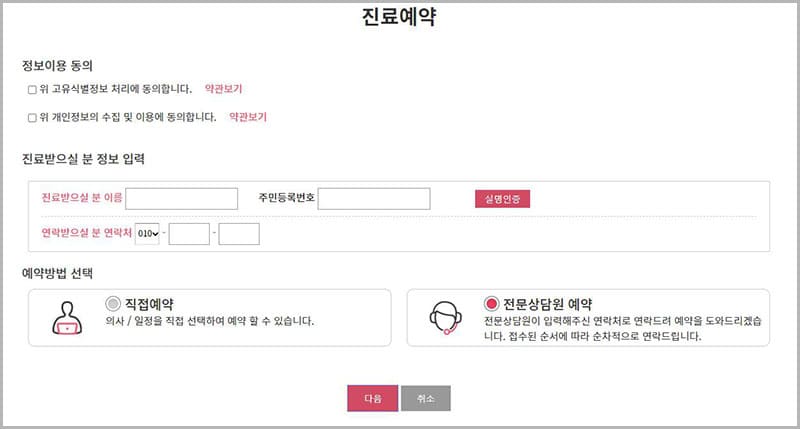 주로 병원에 처음 방문하시는 분들의 진료 예약을 도와드리기 위한 비회원 전용 서비스로, 비회원 예약에서 개인정보와 연락처를 남기시고 ‘전문상담원 예약’에 체크하신 후에 신청을 해주시면 전문상담원이 연락을 드려 쉽고 빠르게 예약을 할 수 있도록 도와 드립니다.